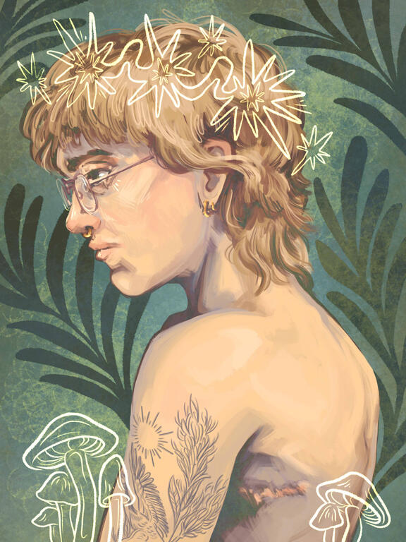 Aster, sometimes also known as Charlie, is an artist with a fascination in the fields of biology from the Canadian Pacific Northwest. They are currently based in the state of Massachusetts while pursuing their BFA in Illustration with a Minor in Creative Writing. Recently, their art has taken the form of comics, zines, poetry, storytelling, and risograph printing, which they use as a vessel for exploring the duality of decay and growth in the natural world.